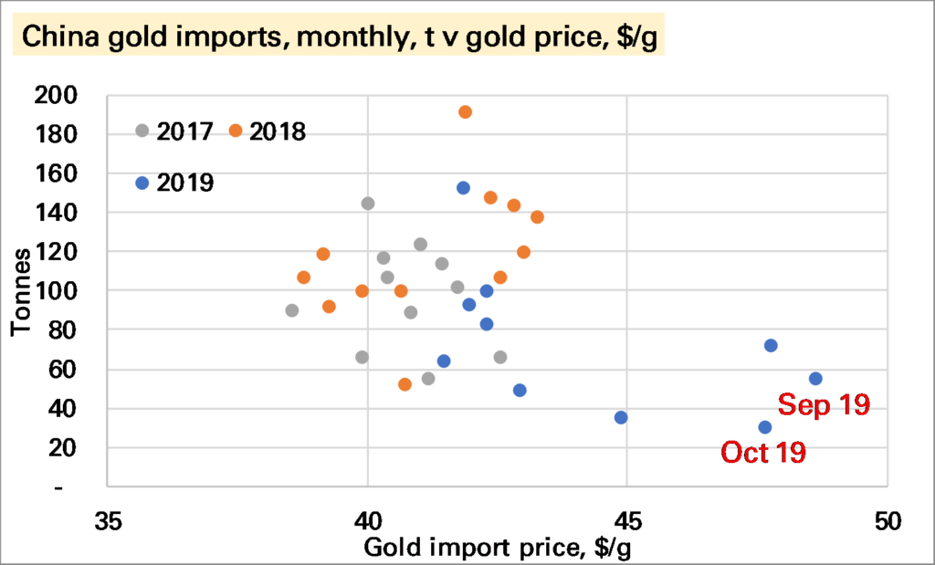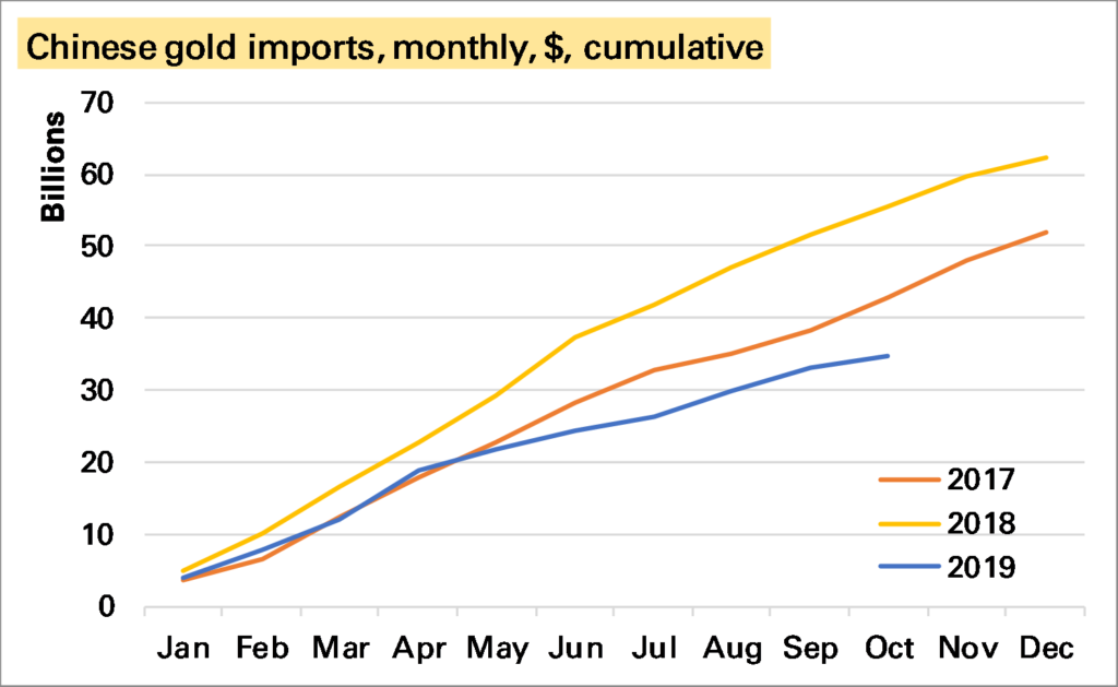 China imported just 35t of gold in October, the lowest monthly amount since it began reporting official trade data from January 2017. Seasonality must have played a role given holidays in October. But while the trajectory of imports looks a little similar to 2018, it is at a far lower level.